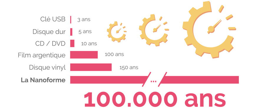 Aujourd’hui, presque tous les supports de stockages peuvent s’abîmer et finir par disparaître avec le temps. Ce n'est pas le cas de la Nanoforme ! Le temps n'altérera pas le support (contrairement au papier) et n'effacera pas le contenu (contrairement à un support numérique).